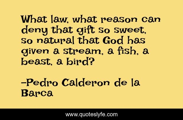 This page presents the quote "What law, what reason can deny that gift so sweet, so natural that God has given a stream, a fish, a beast, a bird?". Author of this quote is Pedro Calderon de la Barca. This quote is about god, law, bird,.