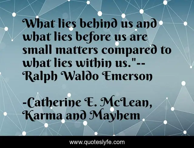 This page presents the quote "What lies behind us and what lies before us are small matters compared to what lies within us."--Ralph Waldo Emerson". Author of this quote is Catherine E. McLean, Karma and Mayhem. .