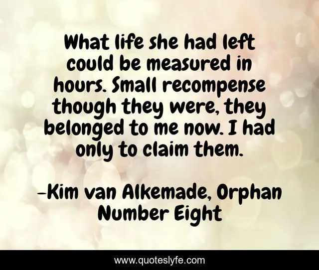 "Kim van Alkemade, Orphan Number Eight Quotes." Quoteslyfe.com, 2025. Fri. 05 Dec. 2025. <https://www.quoteslyfe.com/quote/What-life-she-had-left-could-be-217733>.