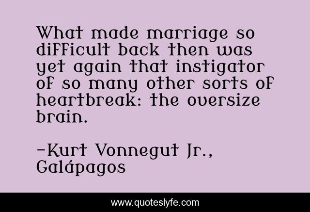This page presents the quote "What made marriage so difficult back then was yet again that instigator of so many other sorts of heartbreak: the oversize brain.". Author of this quote is Kurt Vonnegut Jr., Galápagos. This quote is about brain, heartbreak, marriage, brains,.