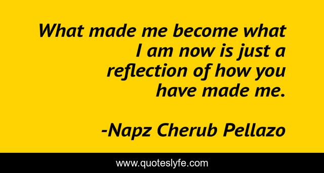 This page presents the quote "What made me become what I am now is just a reflection of how you have made me.". Author of this quote is Napz Cherub Pellazo. This quote is about reflection-on-life, life-lessons, become, of-how-you-have-made-me, yourself, is-just-a-reflection, enthusiasm, inspirational, what-made-me,.