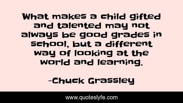 This page presents the quote "What makes a child gifted and talented may not always be good grades in school, but a different way of looking at the world and learning.". Author of this quote is Chuck Grassley. This quote is about world, school, good,.