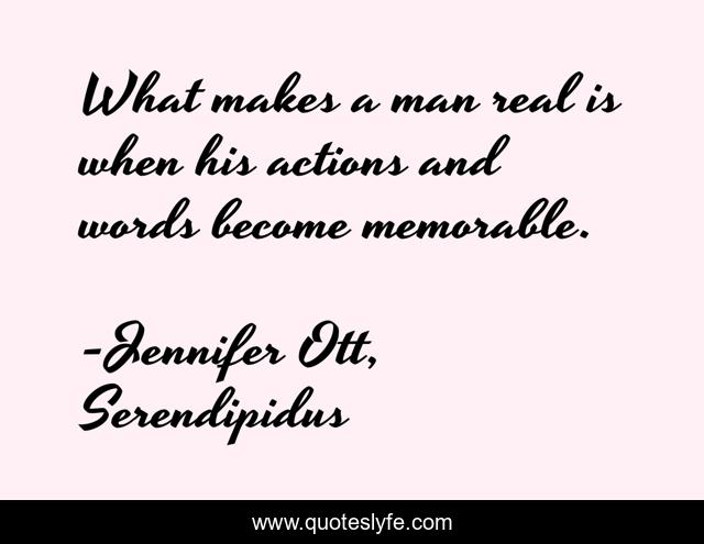 This page presents the quote "What makes a man real is when his actions and words become memorable.". Author of this quote is Jennifer Ott, Serendipidus. This quote is about memorable, legacy, man,.