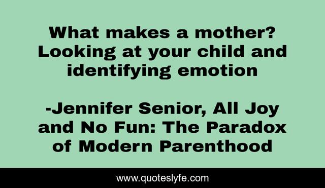 This page presents the quote "What makes a mother? Looking at your child and identifying emotion". Author of this quote is Jennifer Senior, All Joy and No Fun: The Paradox of Modern Parenthood. This quote is about maturation, parenting, discipleship, mentoring, empathy,.