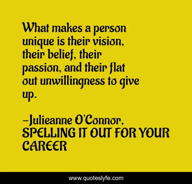 "Julieanne O'Connor, SPELLING IT OUT FOR YOUR CAREER Quotes." Quoteslyfe.com, 2025. Fri. 05 Dec. 2025. <https://www.quoteslyfe.com/quote/What-makes-a-person-unique-is-their-49746>.