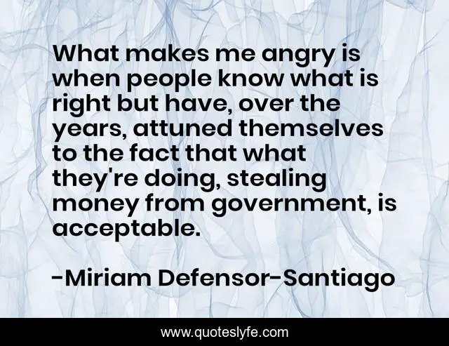 This page presents the quote "What makes me angry is when people know what is right but have, over the years, attuned themselves to the fact that what they're doing, stealing money from government, is acceptable.". Author of this quote is Miriam Defensor-Santiago. This quote is about me, money, people,.
