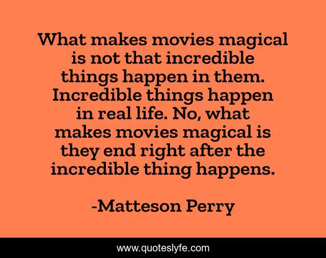 This page presents the quote "What makes movies magical is not that incredible things happen in them. Incredible things happen in real life. No, what makes movies magical is they end right after the incredible thing happens.". Author of this quote is Matteson Perry. This quote is about miracles, relationships, love, movies, incredible-things, affection,.