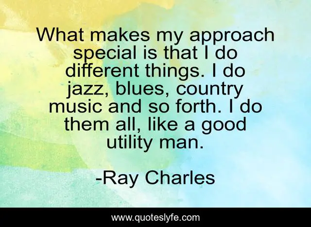 This page presents the quote "What makes my approach special is that I do different things. I do jazz, blues, country music and so forth. I do them all, like a good utility man.". Author of this quote is Ray Charles. This quote is about blues, good, man,.