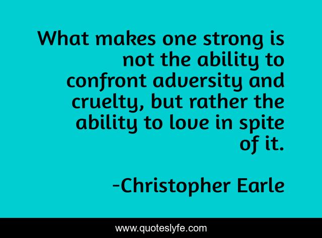 This page presents the quote "What makes one strong is not the ability to confront adversity and cruelty, but rather the ability to love in spite of it.". Author of this quote is Christopher Earle. This quote is about spiritual-growth, spiritual, love, strength-through-adversity, positive, motivational, confidence, growth, optimistic,.