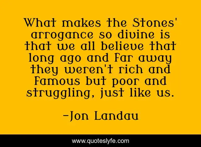 This page presents the quote "What makes the Stones' arrogance so divine is that we all believe that long ago and far away they weren't rich and famous but poor and struggling, just like us.". Author of this quote is Jon Landau. This quote is about believe, long, rich,.