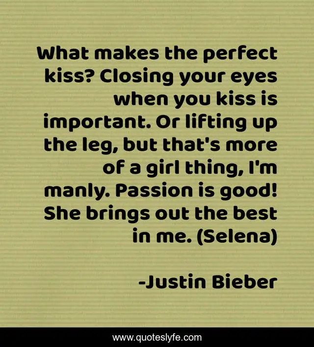 This page presents the quote "What makes the perfect kiss? Closing your eyes when you kiss is important. Or lifting up the leg, but that's more of a girl thing, I'm manly. Passion is good! She brings out the best in me. (Selena)". Author of this quote is Justin Bieber. .