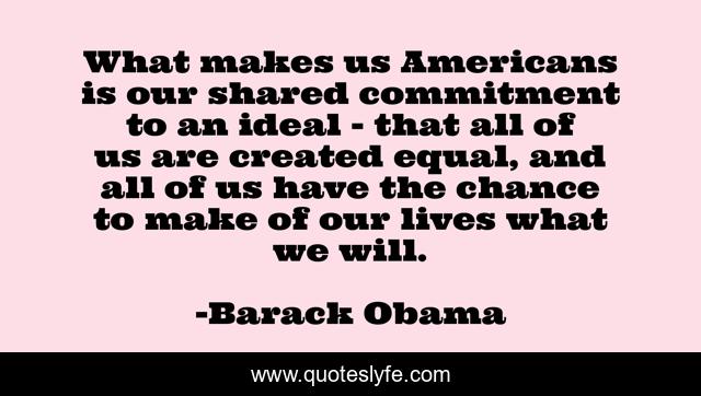 This page presents the quote "What makes us Americans is our shared commitment to an ideal - that all of us are created equal, and all of us have the chance to make of our lives what we will.". Author of this quote is Barack Obama. This quote is about commitment, equal,.