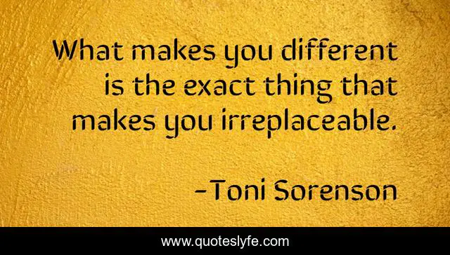 This page presents the quote "What makes you different is the exact thing that makes you irreplaceable.". Author of this quote is Toni Sorenson. This quote is about success, uniqueness, personal-worth, value, people,.