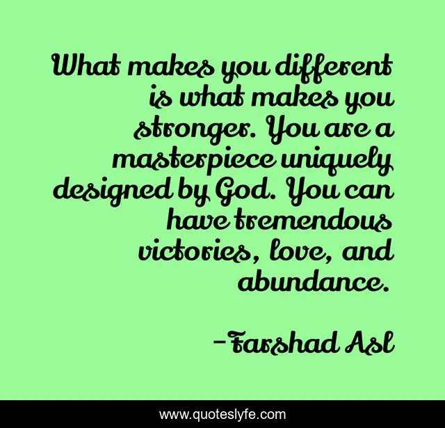 This page presents the quote "What makes you different is what makes you stronger. You are a masterpiece uniquely designed by God. You can have tremendous victories, love, and abundance.". Author of this quote is Farshad Asl. This quote is about different, masterpiece, stronger, designed-by-god,.