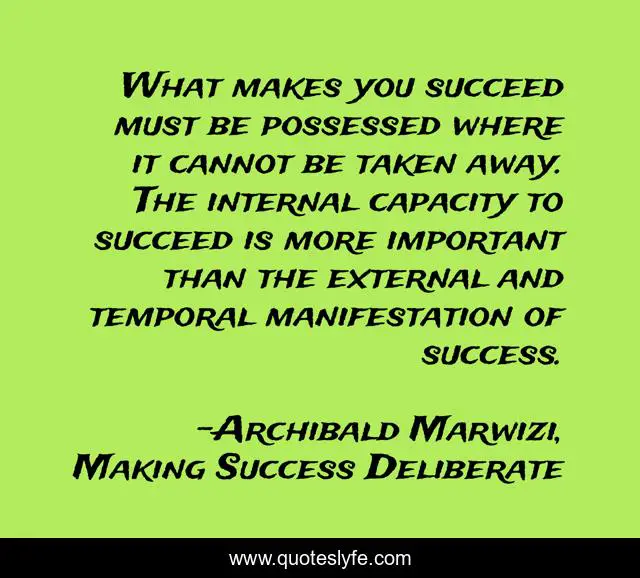 This page presents the quote "What makes you succeed must be possessed where it cannot be taken away. The internal capacity to succeed is more important than the external and temporal manifestation of success.". Author of this quote is Archibald Marwizi, Making Success Deliberate. This quote is about life, success, behaviour, attitude, legacy, growth, purpose, inspirational, leadership,.