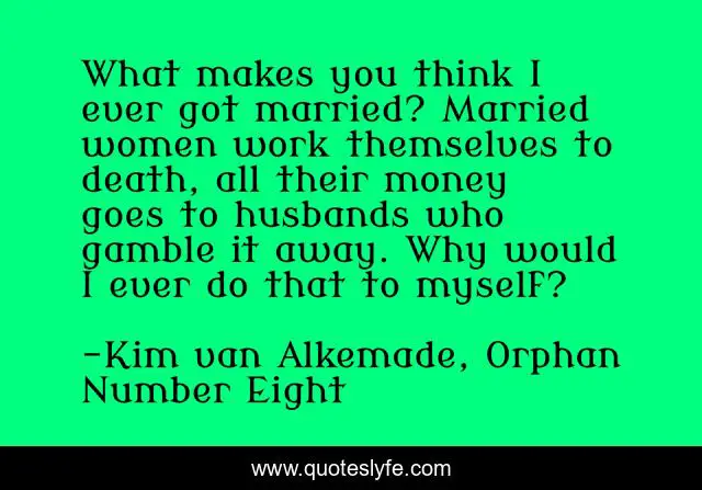 This page presents the quote "What makes you think I ever got married? Married women work themselves to death, all their money goes to husbands who gamble it away. Why would I ever do that to myself?". Author of this quote is Kim van Alkemade, Orphan Number Eight. This quote is about marriage-equality, businesswoman, mrs-hong, chinese-american, equal-pay, marriage, wig-maker, feminism,.