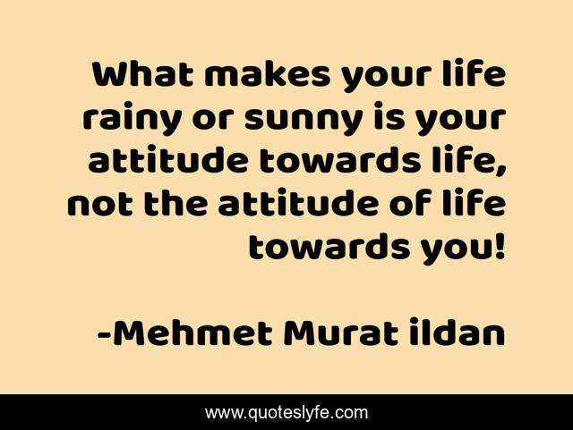 This page presents the quote "What makes your life rainy or sunny is your attitude towards life, not the attitude of life towards you!". Author of this quote is Mehmet Murat ildan. This quote is about life-attitude, turkish-wisdom-words, rainy, attitude-towards-life, ildan-wise-sayings, turkish, ildan-wisdom, sunny, turkish-playwrights,.