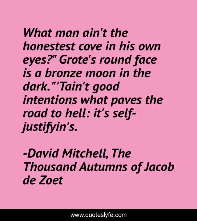 This page presents the quote "What man ain't the honestest cove in his own eyes?" Grote's round face is a bronze moon in the dark. "'Tain't good intentions what paves the road to hell: it's self-justifyin's.". Author of this quote is David Mitchell, The Thousand Autumns of Jacob de Zoet. This quote is about self-justification, good-intentions, honesty, self-perception,.