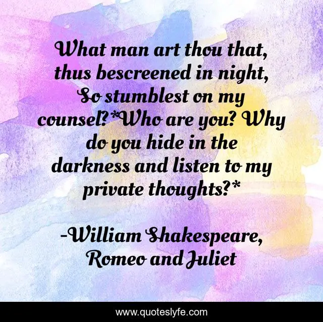This page presents the quote "What man art thou that, thus bescreened in night, So stumblest on my counsel?*Who are you? Why do you hide in the darkness and listen to my private thoughts?*". Author of this quote is William Shakespeare, Romeo and Juliet. This quote is about hilarious, imposition, privacy,.