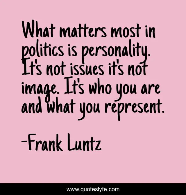 This page presents the quote "What matters most in politics is personality. It's not issues it's not image. It's who you are and what you represent.". Author of this quote is Frank Luntz. This quote is about matters, personality,.