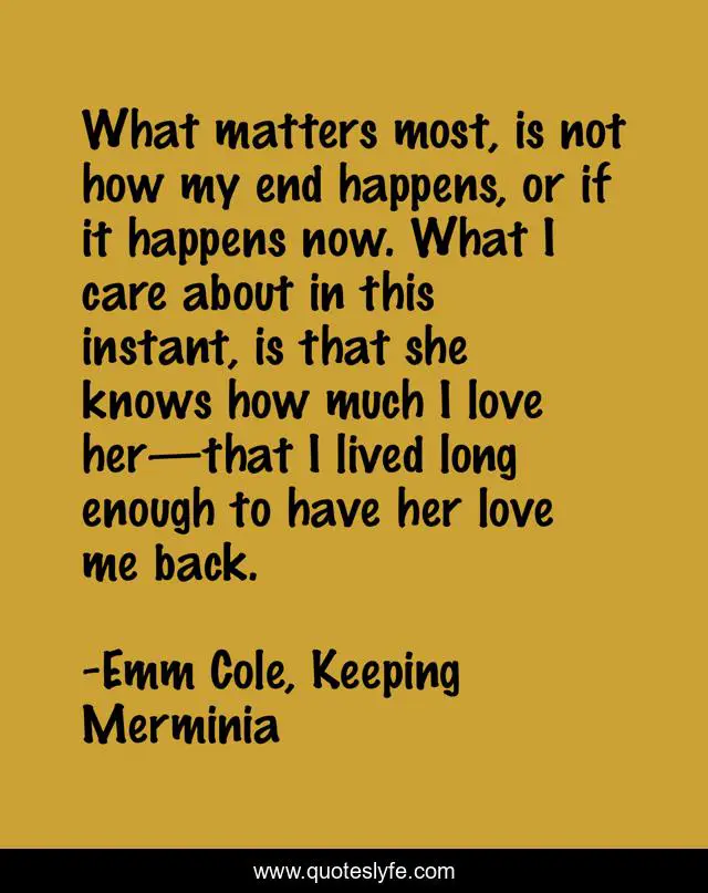 This page presents the quote "What matters most, is not how my end happens, or if it happens now. What I care about in this instant, is that she knows how much I love her—that I lived long enough to have her love me back.". Author of this quote is Emm Cole, Keeping Merminia. This quote is about true-love, death, destiny, soul-mates, fated, against-all-odds, fate, dying-young, unconditional-love,.