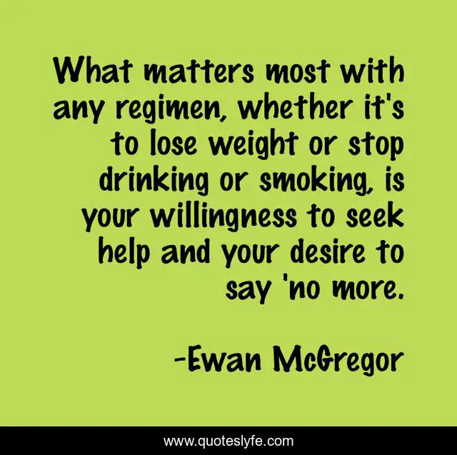 This page presents the quote "What matters most with any regimen, whether it's to lose weight or stop drinking or smoking, is your willingness to seek help and your desire to say 'no more.". Author of this quote is Ewan McGregor. This quote is about enthusiasm, actors, drive, inspirational, goals,.