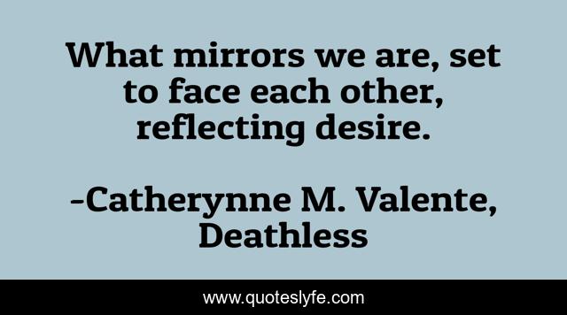 This page presents the quote "What mirrors we are, set to face each other, reflecting desire.". Author of this quote is Catherynne M. Valente, Deathless. This quote is about desire, koschei, marya-morevna,.