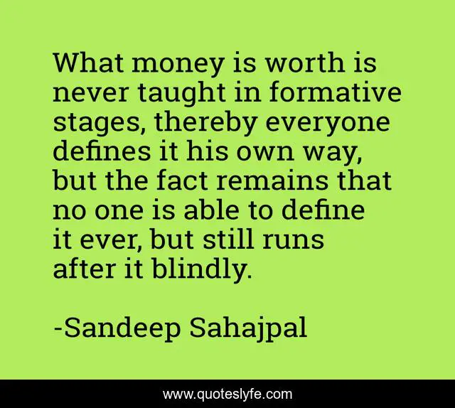 This page presents the quote "What money is worth is never taught in formative stages, thereby everyone defines it his own way, but the fact remains that no one is able to define it ever, but still runs after it blindly.". Author of this quote is Sandeep Sahajpal. .