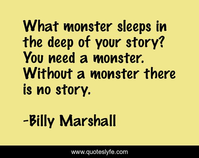 This page presents the quote "What monster sleeps in the deep of your story? You need a monster. Without a monster there is no story.". Author of this quote is Billy Marshall. This quote is about plot, story, narrative, screenwriting, scriptwriting, scripts,.