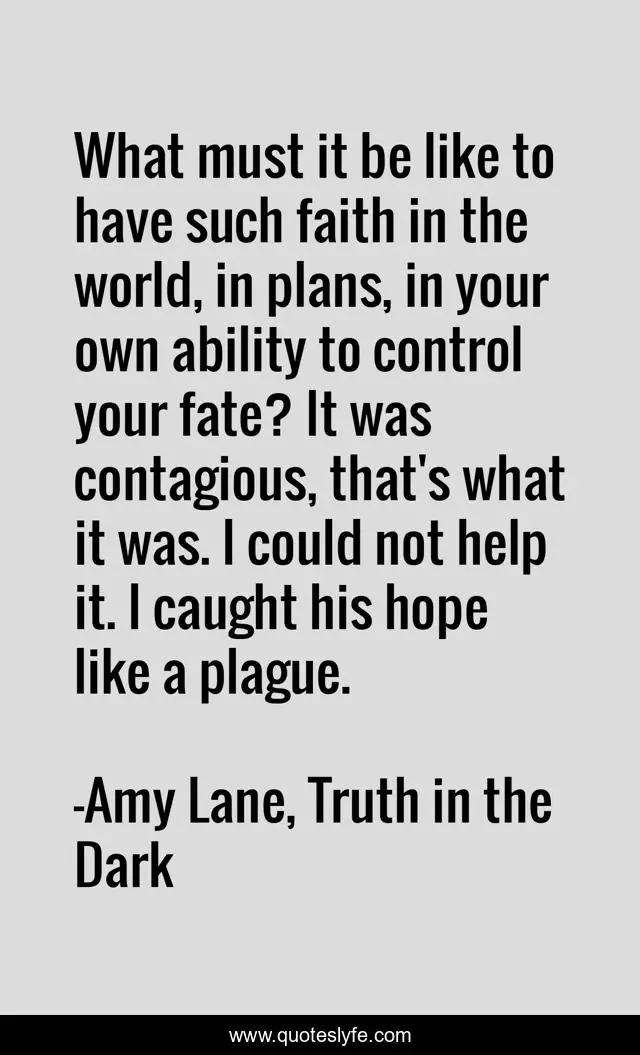 This page presents the quote "What must it be like to have such faith in the world, in plans, in your own ability to control your fate? It was contagious, that's what it was. I could not help it. I caught his hope like a plague.". Author of this quote is Amy Lane, Truth in the Dark. This quote is about fate, hope, naef, knife,.