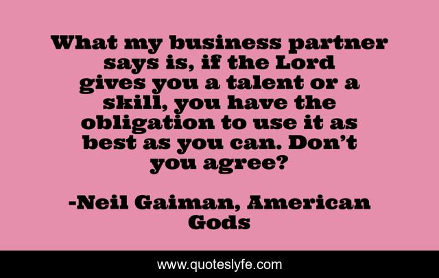 This page presents the quote "What my business partner says is, if the Lord gives you a talent or a skill, you have the obligation to use it as best as you can. Don’t you agree?". Author of this quote is Neil Gaiman, American Gods. This quote is about skill, talent,.
