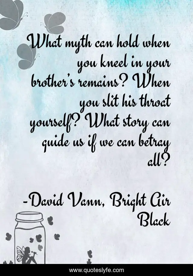 This page presents the quote "What myth can hold when you kneel in your brother’s remains? When you slit his throat yourself? What story can guide us if we can betray all?". Author of this quote is David Vann, Bright Air Black. This quote is about story, myth,.
