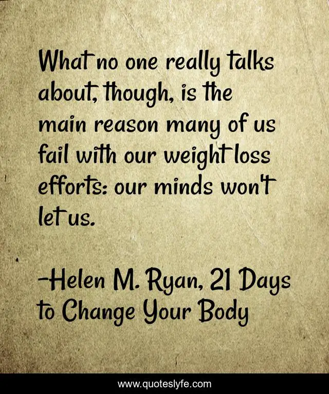 This page presents the quote "What no one really talks about, though, is the main reason many of us fail with our weight loss efforts: our minds won't let us.". Author of this quote is Helen M. Ryan, 21 Days to Change Your Body. This quote is about inner-strength, self-discovery, mind-over-body, weight-loss,.