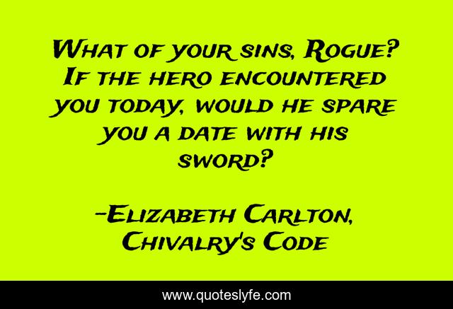 This page presents the quote "What of your sins, Rogue? If the hero encountered you today, would he spare you a date with his sword?". Author of this quote is Elizabeth Carlton, Chivalry's Code. This quote is about justice, rogue, hero, sins,.
