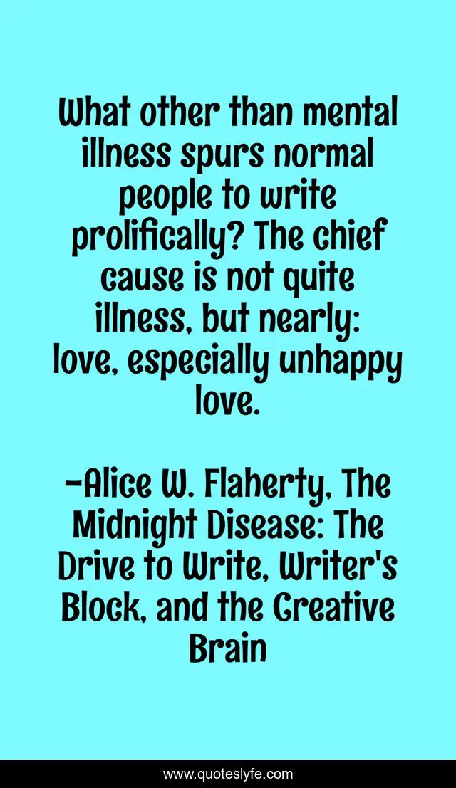 This page presents the quote "What other than mental illness spurs normal people to write prolifically? The chief cause is not quite illness, but nearly: love, especially unhappy love.". Author of this quote is Alice W. Flaherty, The Midnight Disease: The Drive to Write, Writer's Block, and the Creative Brain. This quote is about love, mental-illness, affection, writing,.