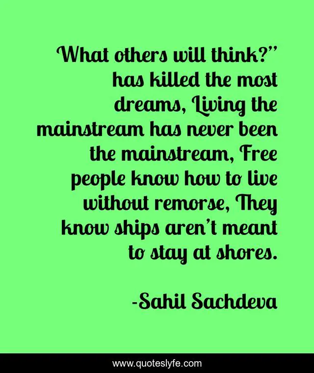 This page presents the quote "What others will think?” has killed the most dreams, Living the mainstream has never been the mainstream, Free people know how to live without remorse, They know ships aren’t meant to stay at shores.". Author of this quote is Sahil Sachdeva. This quote is about freedom, cage, quotes,.