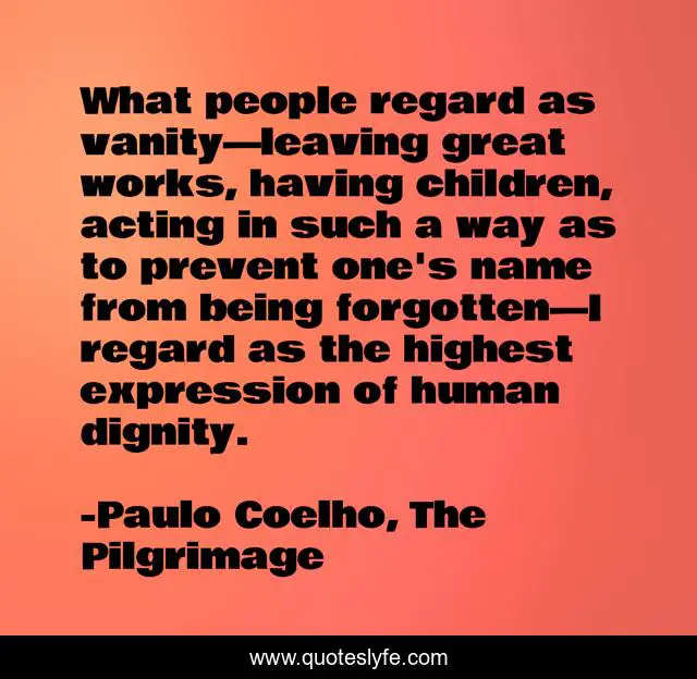 This page presents the quote "What people regard as vanity—leaving great works, having children, acting in such a way as to prevent one's name from being forgotten—I regard as the highest expression of human dignity.". Author of this quote is Paulo Coelho, The Pilgrimage. This quote is about dignity, vanity,.