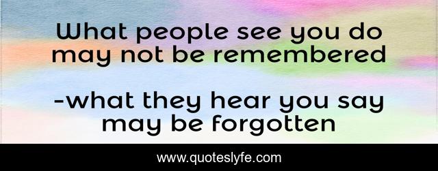 This page presents the quote "What people see you do may not be remembered". Author of this quote is what they hear you say may be forgotten. .