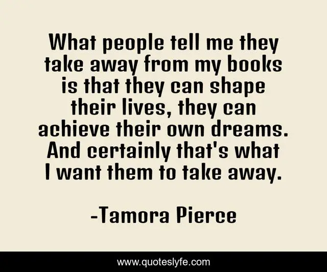 This page presents the quote "What people tell me they take away from my books is that they can shape their lives, they can achieve their own dreams. And certainly that's what I want them to take away.". Author of this quote is Tamora Pierce. This quote is about me, people,.