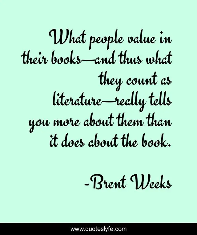 This page presents the quote "What people value in their books—and thus what they count as literature—really tells you more about them than it does about the book.". Author of this quote is Brent Weeks. This quote is about literature, snobbery,.