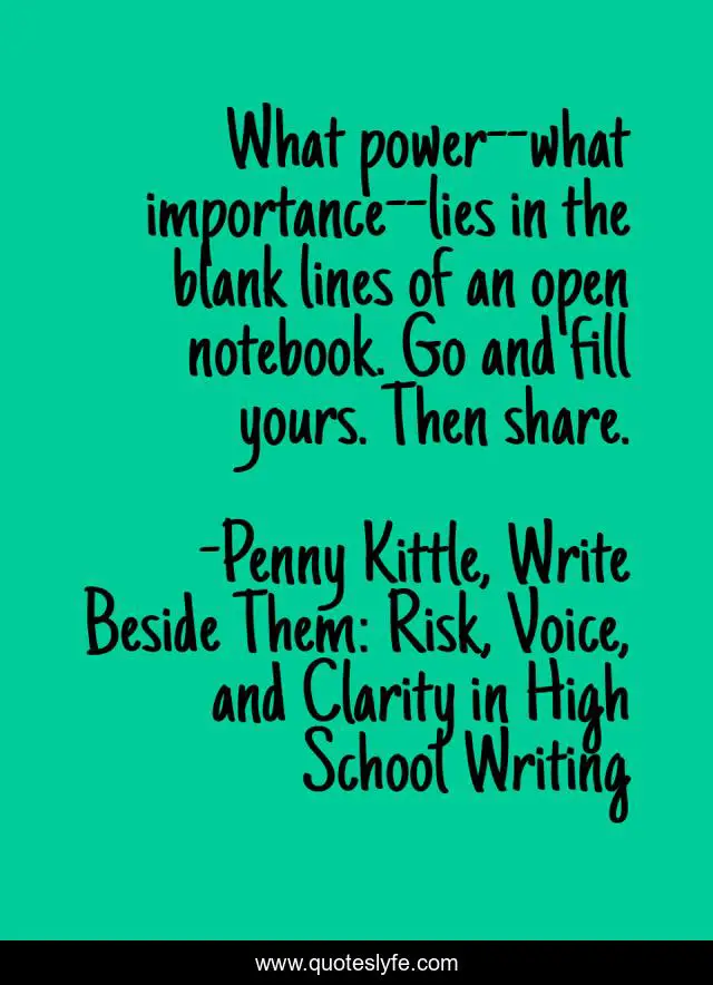 This page presents the quote "What power--what importance--lies in the blank lines of an open notebook. Go and fill yours. Then share.". Author of this quote is Penny Kittle, Write Beside Them: Risk, Voice, and Clarity in High School Writing. .