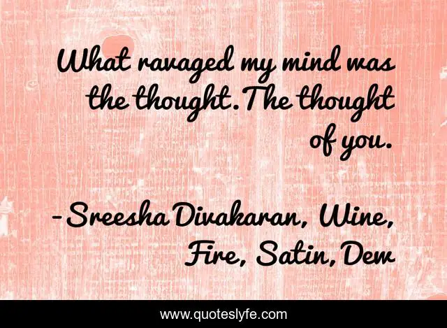 This page presents the quote "What ravaged my mind was the thought.The thought of you.". Author of this quote is Sreesha Divakaran, Wine, Fire, Satin, Dew. This quote is about lust, thought,.