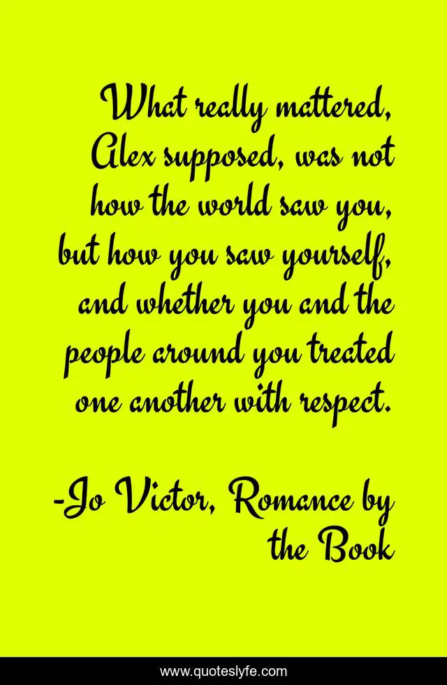 This page presents the quote "What really mattered, Alex supposed, was not how the world saw you, but how you saw yourself, and whether you and the people around you treated one another with respect.". Author of this quote is Jo Victor, Romance by the Book. This quote is about relationships, romance, alex, what-matters-most, see-the-world, respect,.