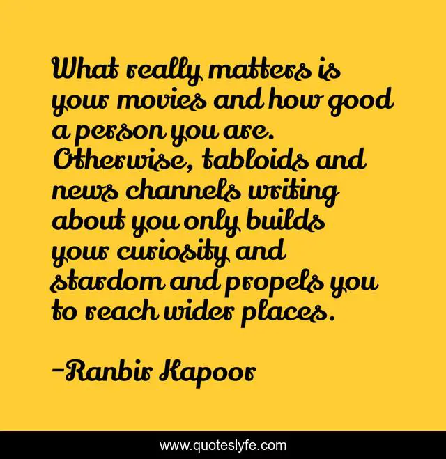 This page presents the quote "What really matters is your movies and how good a person you are. Otherwise, tabloids and news channels writing about you only builds your curiosity and stardom and propels you to reach wider places.". Author of this quote is Ranbir Kapoor. This quote is about good, curiosity, writing,.