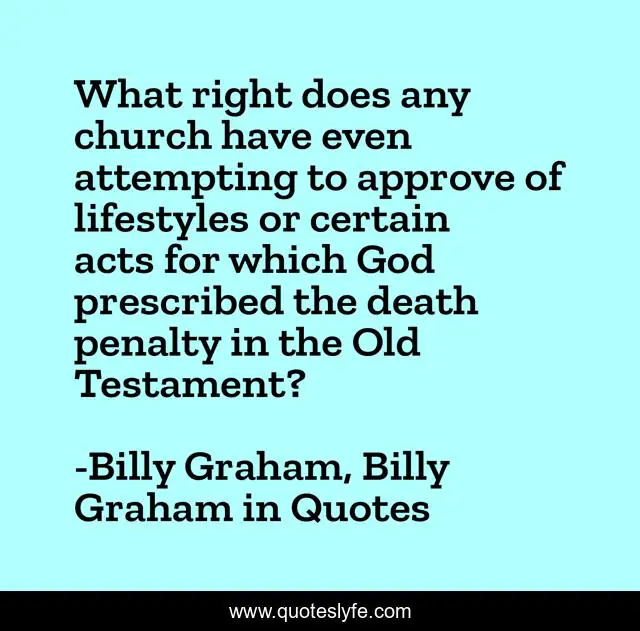 This page presents the quote "What right does any church have even attempting to approve of lifestyles or certain acts for which God prescribed the death penalty in the Old Testament?". Author of this quote is Billy Graham, Billy Graham in Quotes. This quote is about billy-graham, church,.