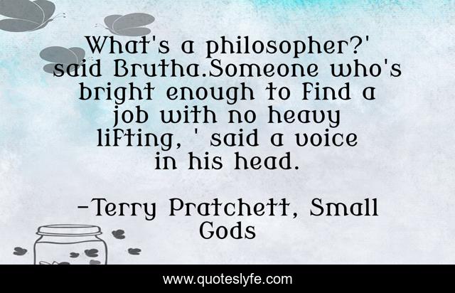 This page presents the quote "What's a philosopher?' said Brutha.Someone who's bright enough to find a job with no heavy lifting, ' said a voice in his head.". Author of this quote is Terry Pratchett, Small Gods. .