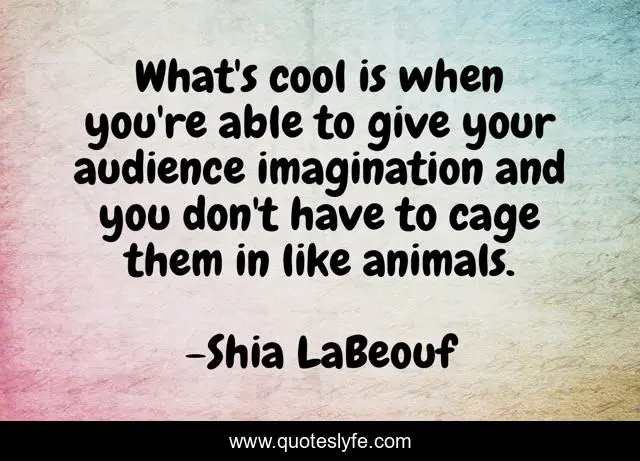 This page presents the quote "What's cool is when you're able to give your audience imagination and you don't have to cage them in like animals.". Author of this quote is Shia LaBeouf. This quote is about imagination, animals,.