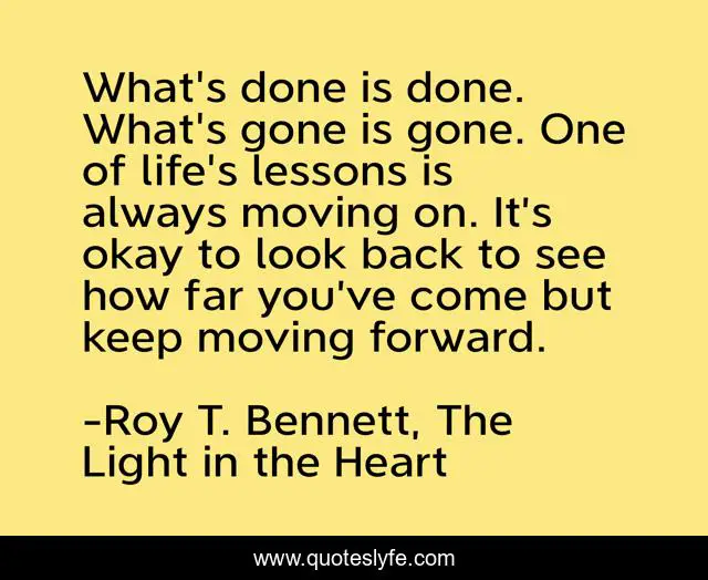 This page presents the quote "What's done is done. What's gone is gone. One of life's lessons is always moving on. It’s okay to look back to see how far you’ve come but keep moving forward.". Author of this quote is Roy T. Bennett, The Light in the Heart. This quote is about living, inspiring, inspire, inspiration, positive, positive-affirmation, motivational, life, confidence,.