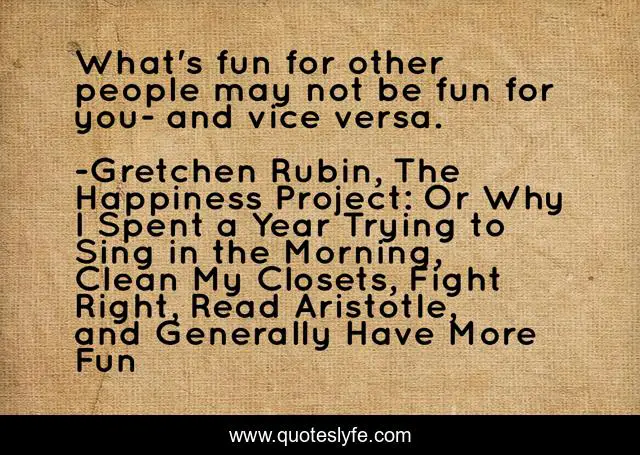 "Gretchen Rubin, The Happiness Project: Or Why I Spent a Year Trying to Sing in the Morning, Clean My Closets, Fight Right, Read Aristotle, and Generally Have More Fun Quotes." Quoteslyfe.com, 2025. Tue. 09 Dec. 2025. <https://www.quoteslyfe.com/quote/What-s-fun-for-other-people-may-214751>.