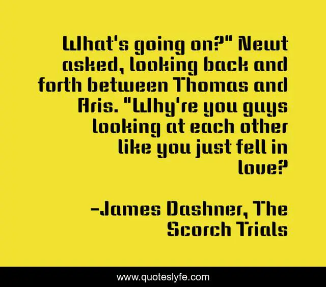 This page presents the quote "What's going on?" Newt asked, looking back and forth between Thomas and Aris. "Why're you guys looking at each other like you just fell in love?". Author of this quote is James Dashner, The Scorch Trials. This quote is about aris, thomas, humor, newt,.